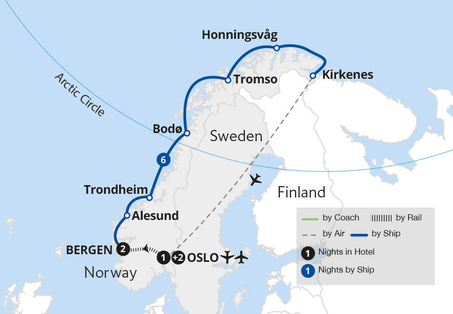Join us on a summertime journey across the length of Norway - from Oslo to the Arctic Circle. Travel on four of the country's world-renowned rail routes, the Flåm, Bergen, Nordland and Rauma railways and cruise across the Geirangerfjord, discovering otherworldly landscapes. On this top-rated tour of Norway's beautiful cities and the arctic...