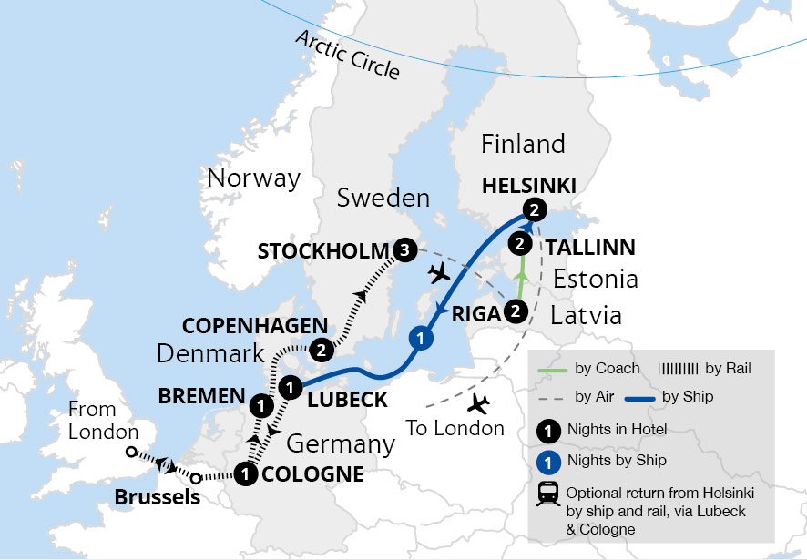 Embark on an amazing exploration of six incredible countries. Travelling through Denmark and Sweden, cross the Baltic Sea to explore the idyllic charms of Latvia, Estonia and Finland, before flying by from Helsinki - or opt to return by ferry and rail. Experience the history and distinct culture of these attractive capital cities, taking in...