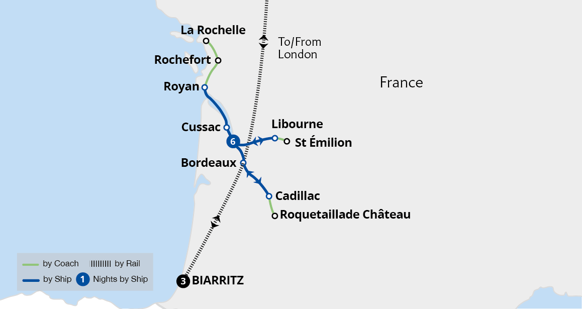 Experience the idyllic landscapes of the Bordeaux wine region on a leisurely river cruise on the Garonne and Dordogne. Discover Bordeaux's 18th-century grandeur and cruise to medieval St Émilion, where ancient caves and Europe's largest monolithic church await. Explore the renowned Médoc wine route, visit the prestigious Rochefort and...