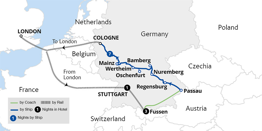 Explore timeless Bavaria and journey on the superb Zugsptitzbahn before a luxurious river cruise along the Danube, Main, and Rhine rivers to explore nine enchanting medieval cities from Regensburg to Strasbourg. During a stay in the picturesque town of Füssen, experience panoramic views from the summit of the Zugspitze, Germany's highest ...