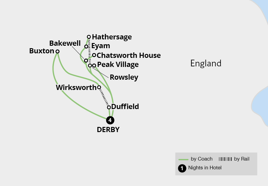 Uncover some of rural England's most picturesque landscapes on a scenic journey through Derbyshire and the Peak District. Visit the elegant spa town of Buxton with a local guide and learn about its Roman origins. Explore Bakewell's historic buildings and perhaps sample one of its famous desserts, before visiting the magnificent Chatsworth...