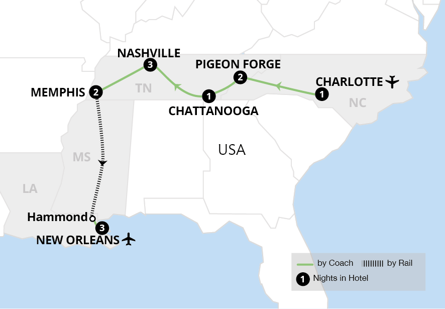 Historic tracks lead us on an unforgettable rail tour through the heartlands of great American music. Uncover the home of country music in Nashville with a visit to the Grand Ole Opry; explore the roots of blues and rock'n'roll at Graceland and Sun Studios in Memphis; and embrace the expressive jazz of New Orleans and the spirited French Quarter.