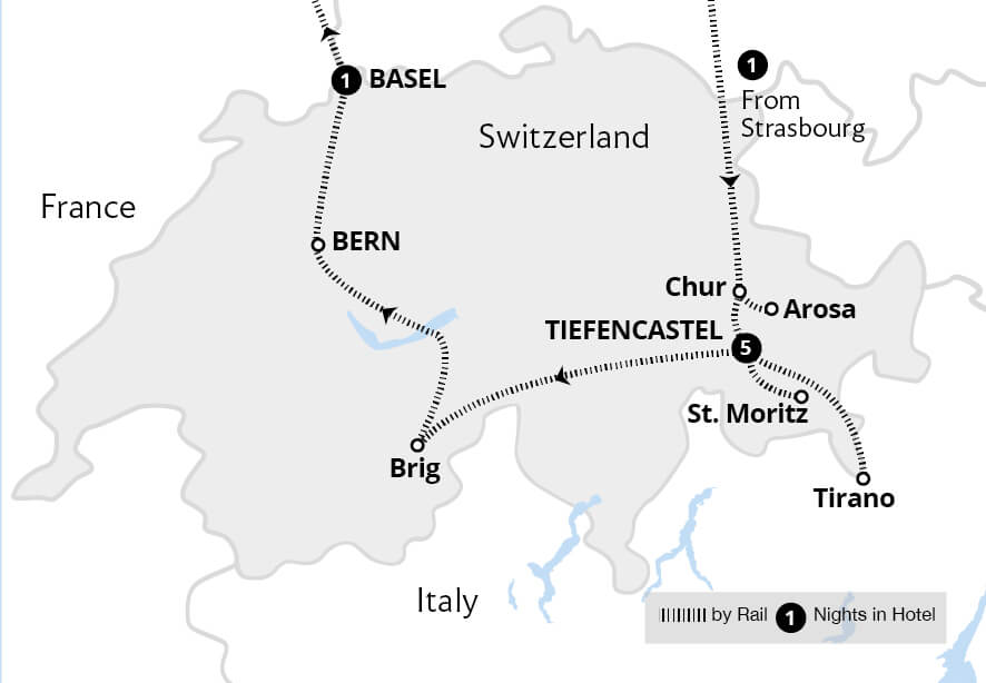 Switzerland. Travelling to Tiefencastel via Basel and Chur, the