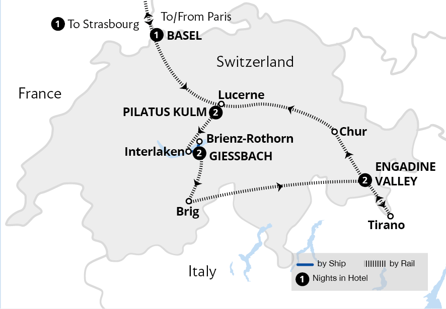 Your memorable Swiss holiday begins at London St Pancras as we board the Eurostar in Plus class. Enjoying a light meal at our seats, we make our way to Paris, then take a direct train to Basel - the quickest route to Switzerland.
