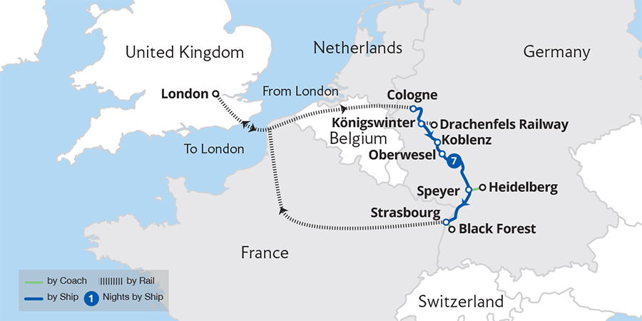 Continuing our journey, we discover Cochem's medieval charm, Bernkastel-Kues' vineyard-draped hillsides, and Trier's historic architecture. This holiday ends with panoramic vistas aboard the Drachenfels railway as we enjoy unforgettable views of the Rhine Valley. Join us and let the Rhine and Moselle be your guide to a spectacular cruise.
