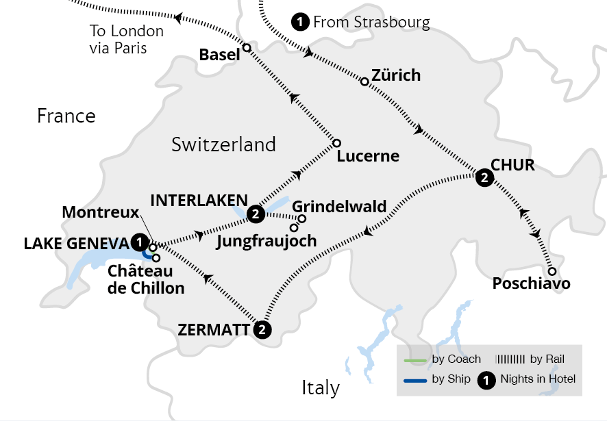 View majestic mountains including the iconic Matterhorn from charming Zermatt, explore the medieval castle of Château du Chillon and sail across serene Lake Geneva.