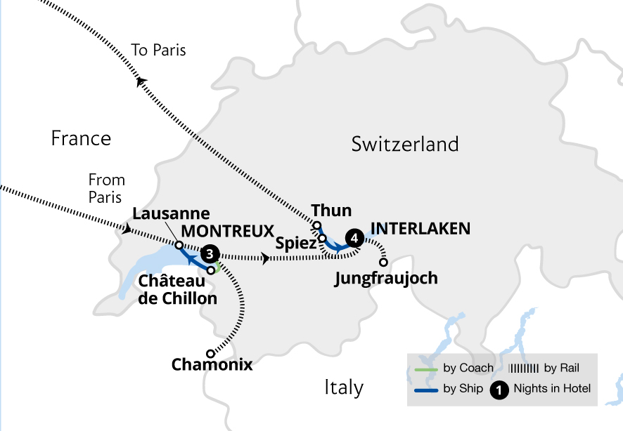 On this sensational holiday, travel from Montreux on the shores of Lake Geneva to the mountainous surroundings of the Jungfrau Massif. Explore Château de Chillon, sail on Lake Geneva and cross the Alps to the French mountain town of Chamonix on the Mont Blanc Express.