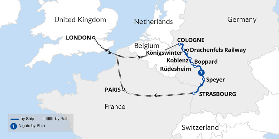 From Cologne, we sail south to explore the town of Koblenz, enjoy a guided tour of Heidelberg, and wander Strasbourg's winding alleys lined with half-timbered houses. Along the way, we stop in Rüdesheim to see the famous Drosselgasse alley and soak up amazing scenery as we leisurely cruise.