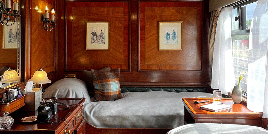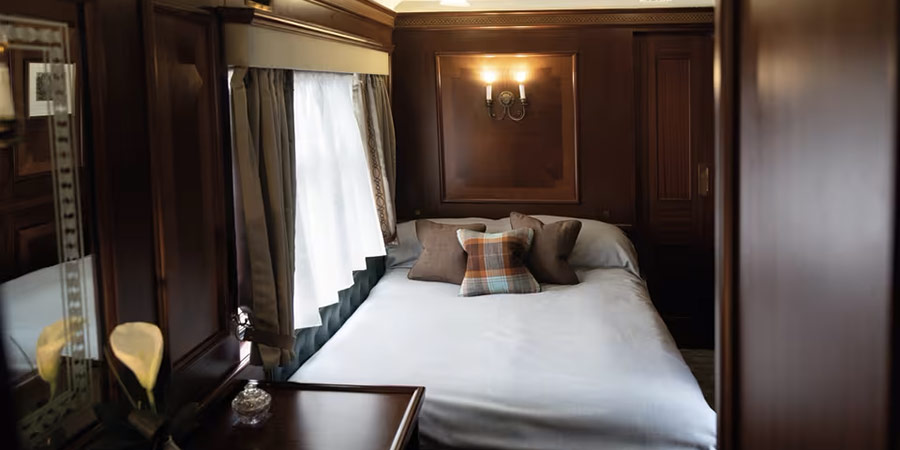 You and a travel companion enjoy a private Highland retreat in the Royal Scotsman's Twin Cabins. Designed with rest and relaxation in mind, these cabins include two lower twin-sized beds, both plush with sumptuous bedding. Each of the 12 Twin Cabins features a well-designed ensuite bathroom with a shower and an unforgettable perspective on the passing mountains, valleys and lochs.